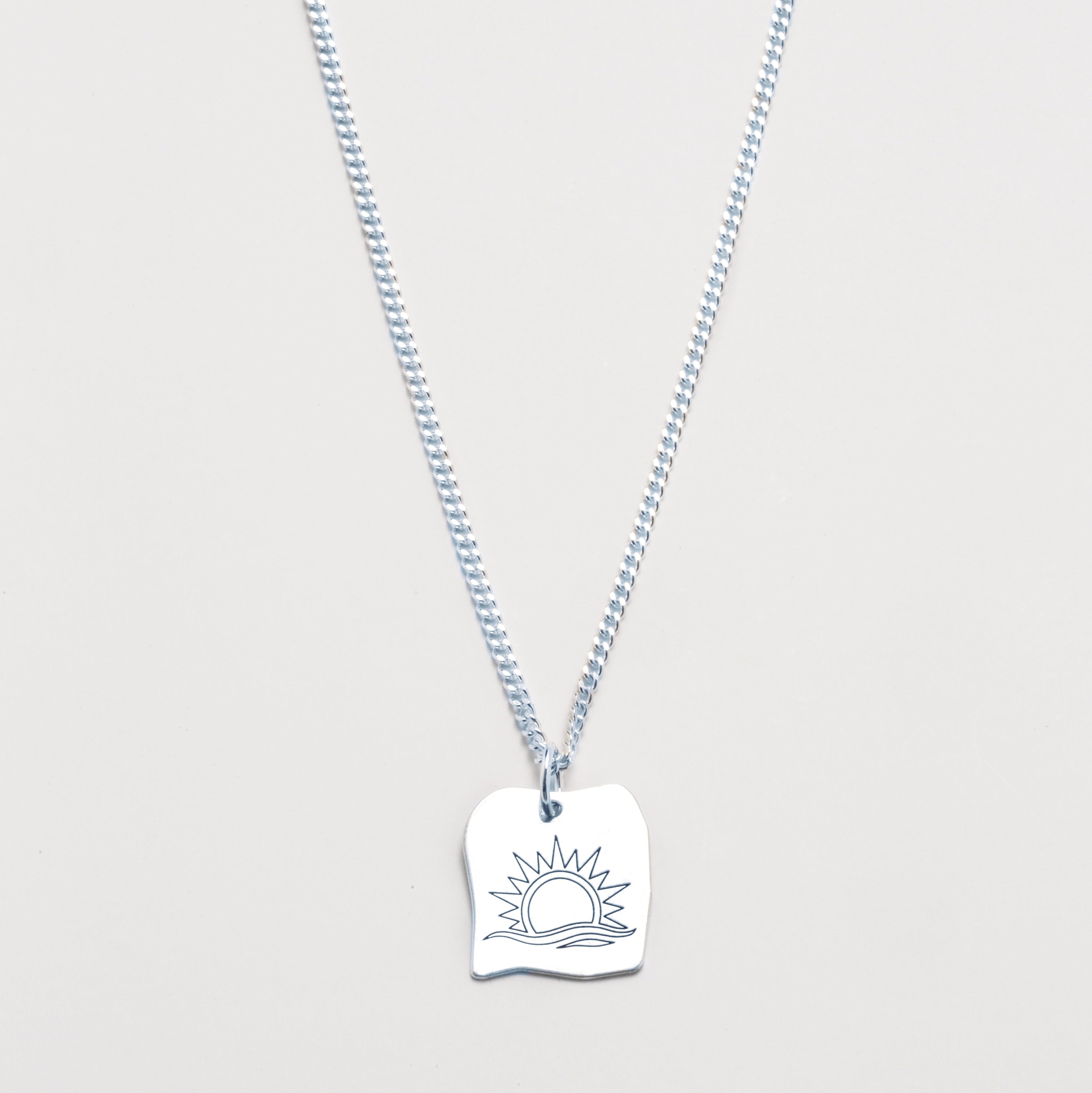 A bold statement for those who chase the horizon. This Silver Square Sunset Necklace features a detailed sunset design, symbolizing adventure, resilience, and the pursuit of new beginnings. Crafted from high-quality 925 sterling silver, it’s waterproof, sweatproof, and tarnish-resistant, built to endure any journey. Paired with a sturdy silver plated in rhodium chain, this necklace is perfect for everyday wear—whether you're exploring new places or making moves in the city.