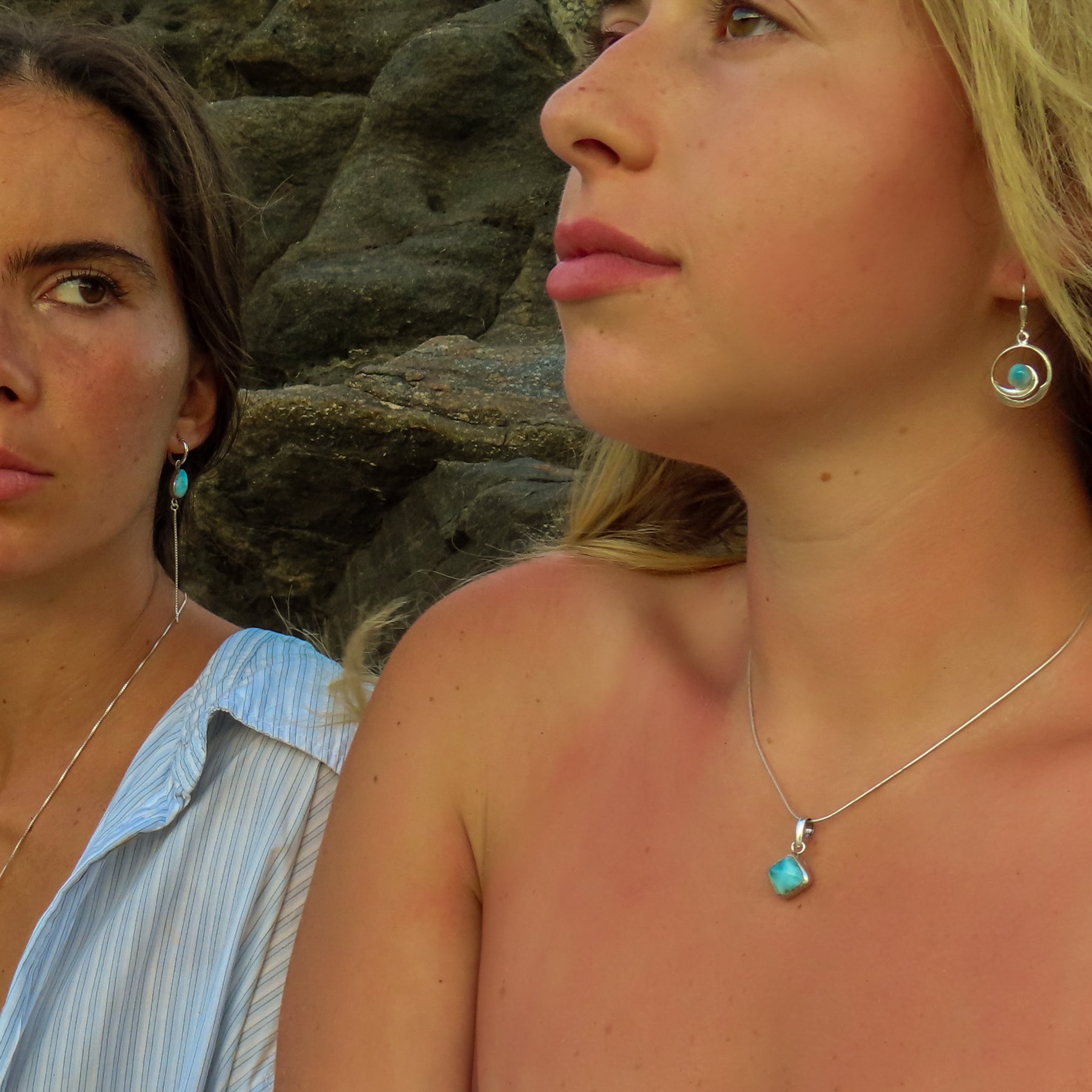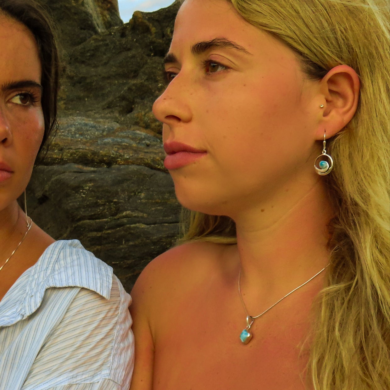 The Larimar Water Nation Earrings channel the spirit of the sea in motion. Featuring genuine circular Larimar stones cradled in a hand-carved wave design, each pair is crafted in 925 sterling silver and made to mirror the natural ebb and flow of the ocean.