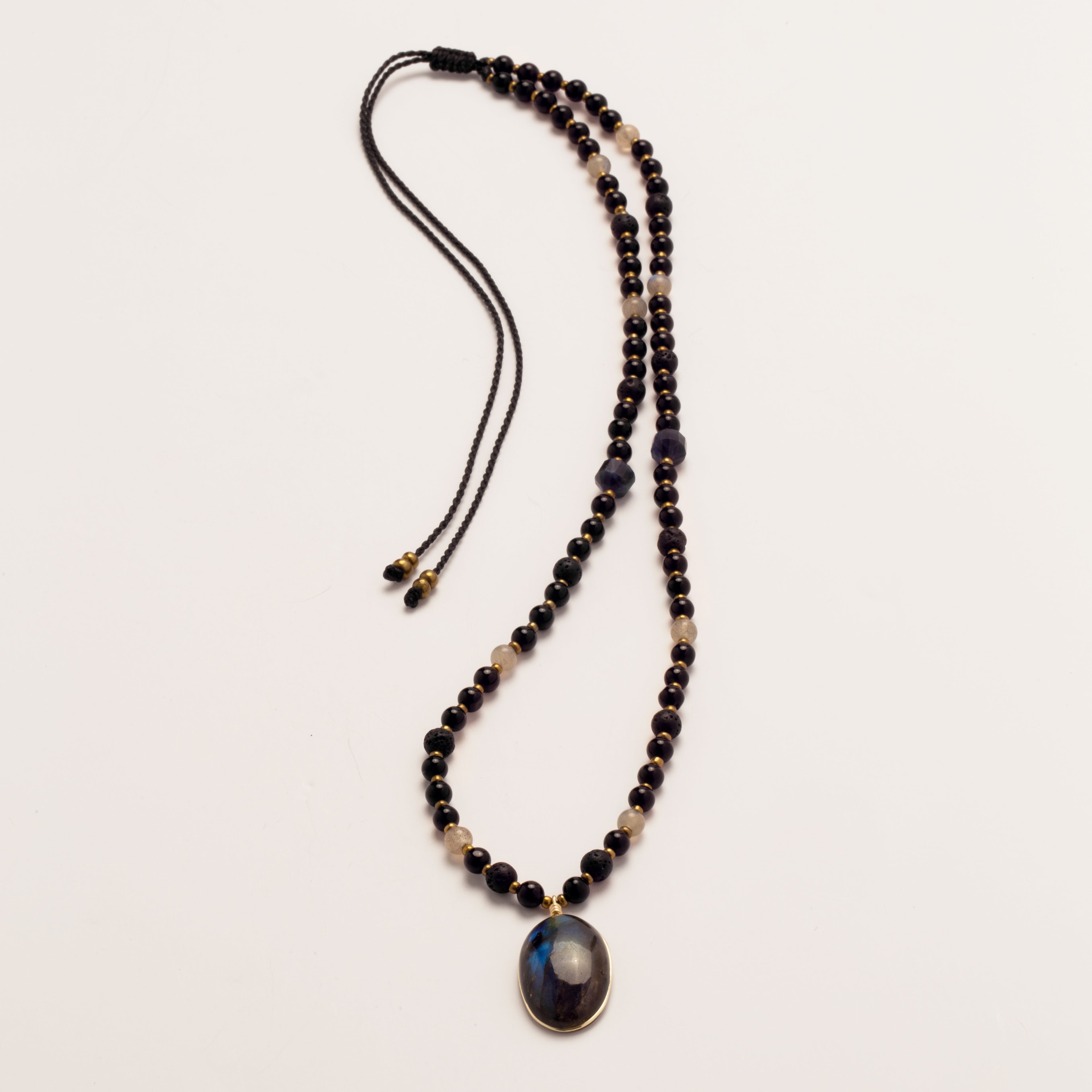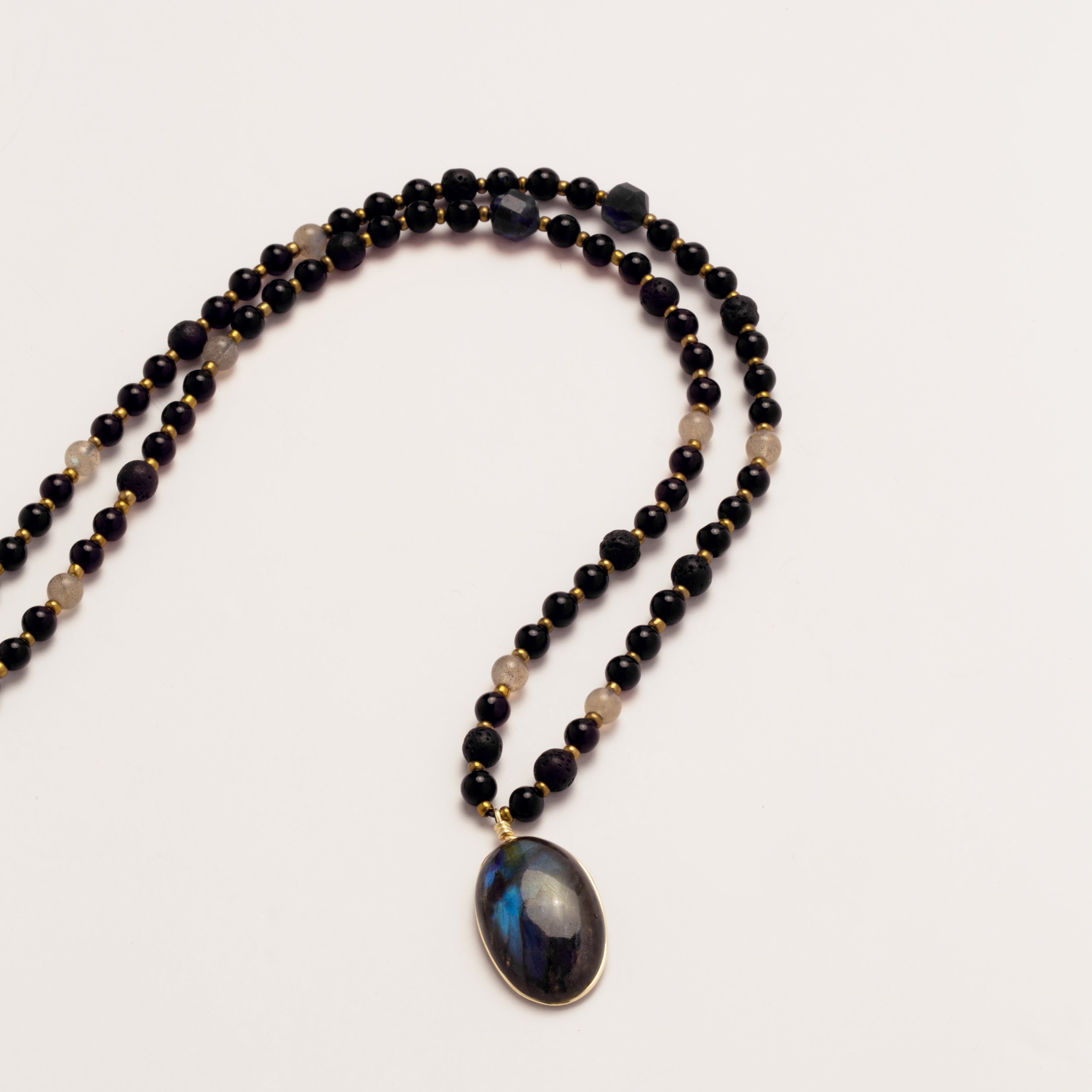 Lava Stone is known as the Stone of Strength and Courage, grounding the wearer and promoting emotional stability. Paired with Labradorite, the Stone of Transformation and Magic, this necklace is believed to enhance intuition, protect against negativity, and bring forth inner strength. The shimmering hues of the Labradorite pendant add a captivating touch, symbolizing light within the darkness.